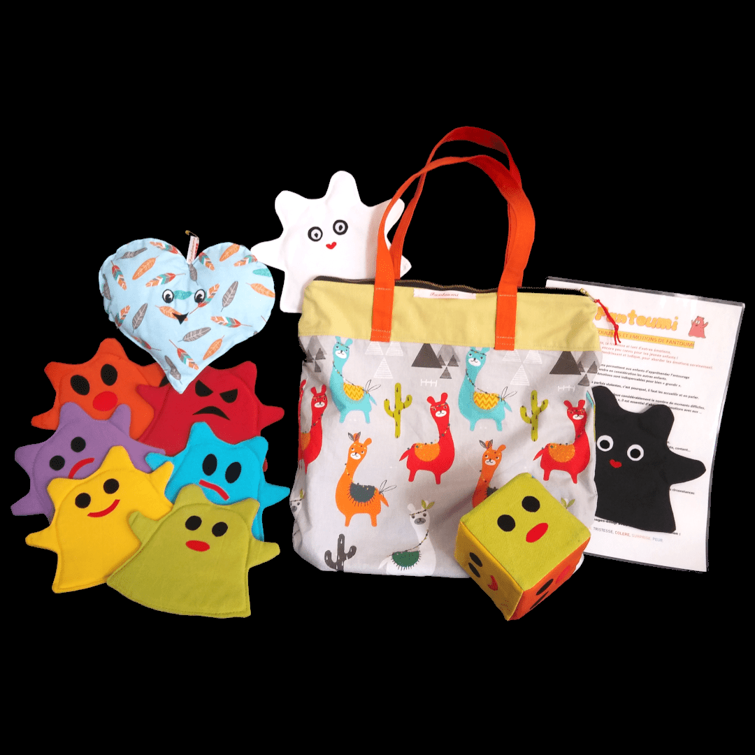 L 35 cm, H 35 cm. Contient 8 Fantoumi avec des émotions et couleurs distinctes, un dé, un cœur pour les câlins, un joli sac de rangement et une notice explicative complète.